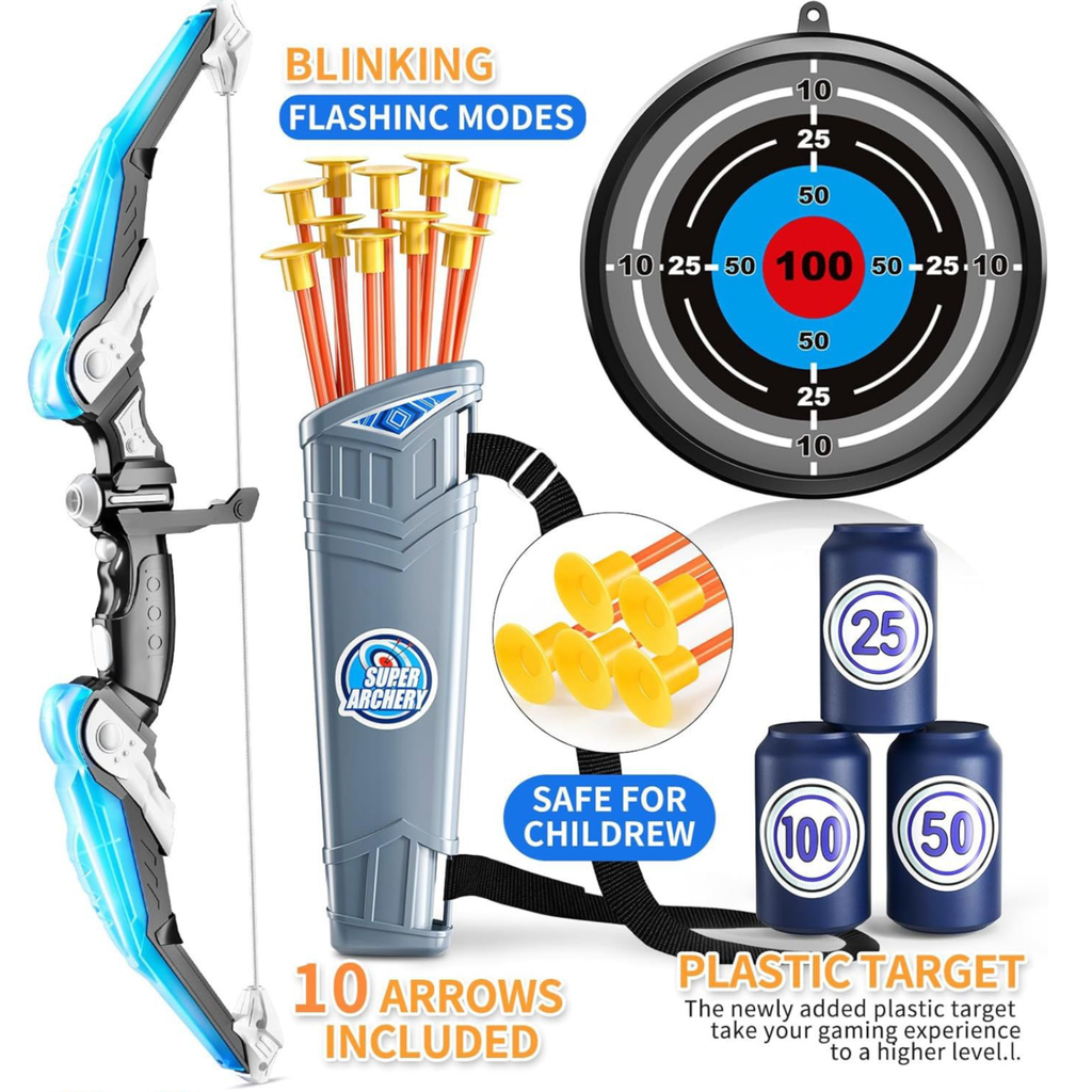 Includes: 1 Blue LED Bow, 10 soft-tip suction-cup arrows, 1 adjustable quiver for easy carrying, 1 target, and 3 foam practice cans.