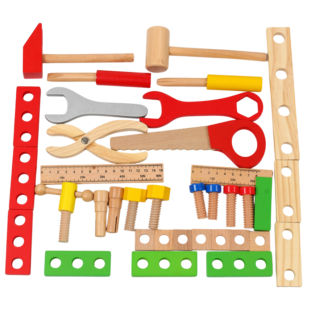 Complete 36-Piece Tool Set: Includes a hammer, wrench, screwdriver, saw, nuts, bolts, rulers, connecting plates, and more — everything your child needs to pretend “fix and build.”