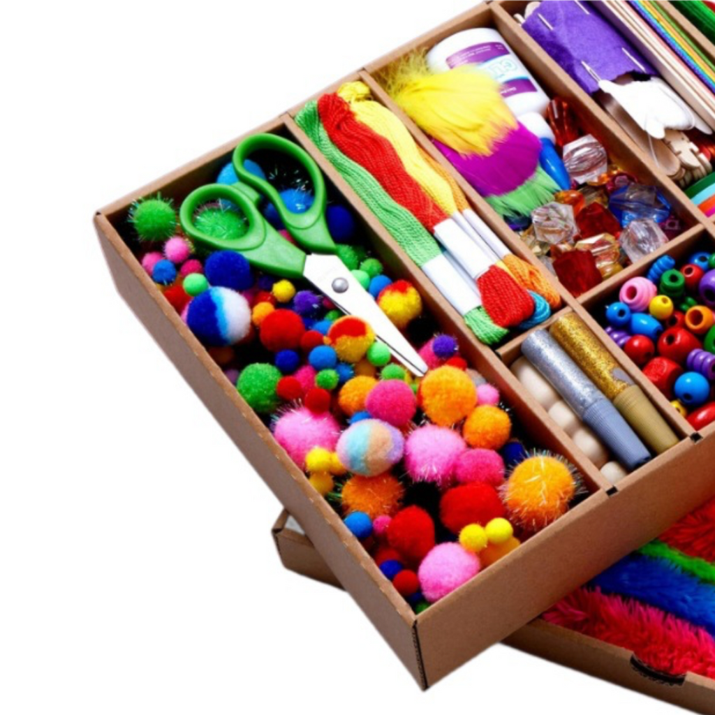 • 3000+ craft pieces: pom-poms, sequins, beads, feathers, glitter, pipe cleaners, craft sticks, safety scissors, glue, and more